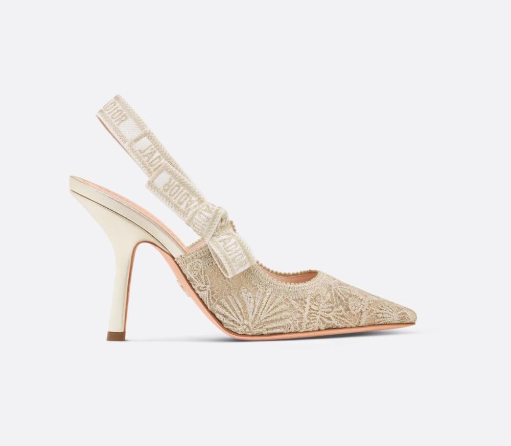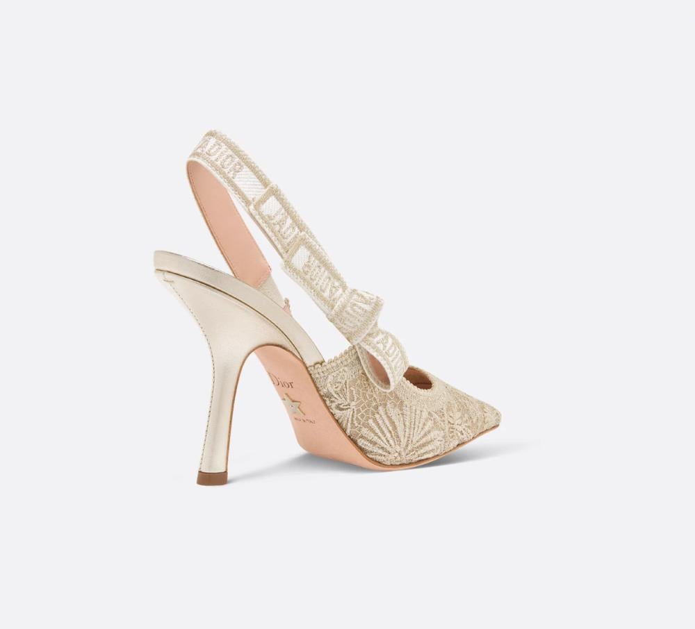 تعتبر مضخة J'Adior ذات الحزام الخلفي مثالًا رائعًا على براعة Dior. إنه منتج من شغف مشاغل كريستيان ديور الإيطالية، وهو مصنوع من شبكة شفافة مع تطريز بخيوط معدنية ذهبية اللون يستنسخ تصميم بيترو روفو ديور شاردونز، الذي يمثل زهرة اسكتلندا الوطنية، التي ترمز إلى الحماية والمرونة والحرية. الشريط ذو اللونين الذي يحمل توقيع J'Adior، والمطرز أيضًا بخيط معدني ذهبي اللون، مزين بفيونكة مسطحة، في حين أن الكعب الفاصلة بطول 10 سم يكمل النموذج بأناقة وراقية. إنه مثالي للدمج مع الإبداعات الأخرى من مجموعة Dior Chardons.