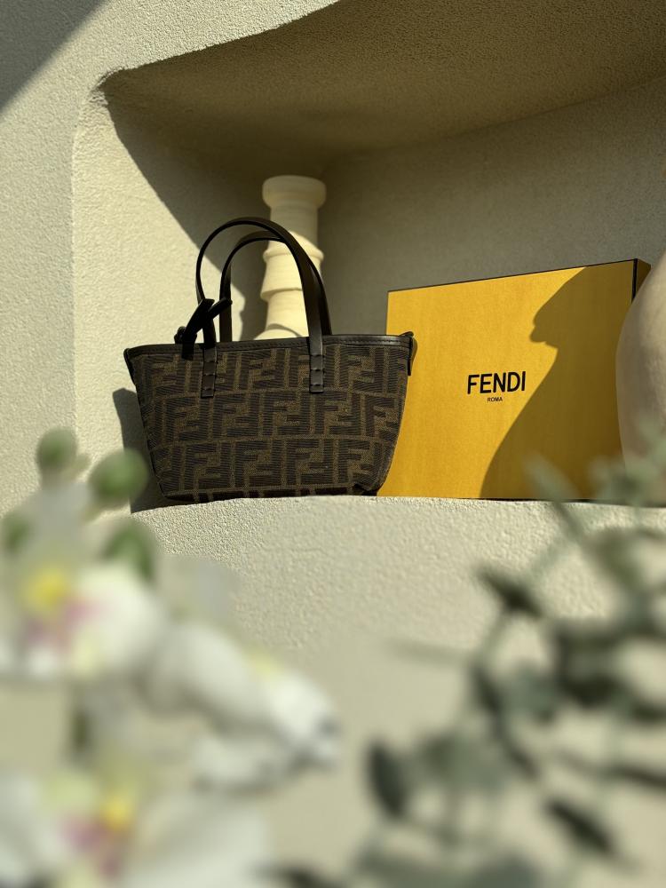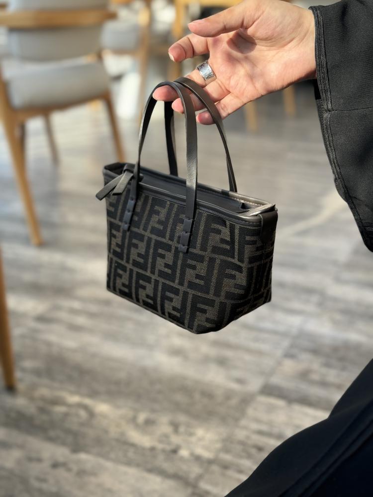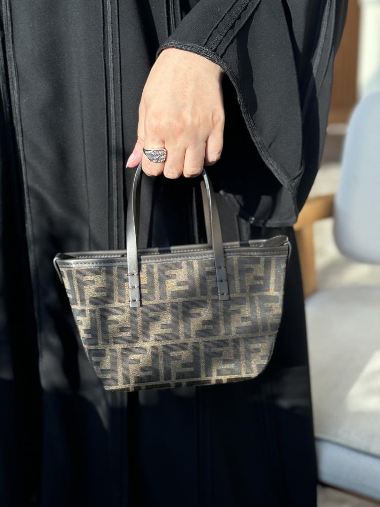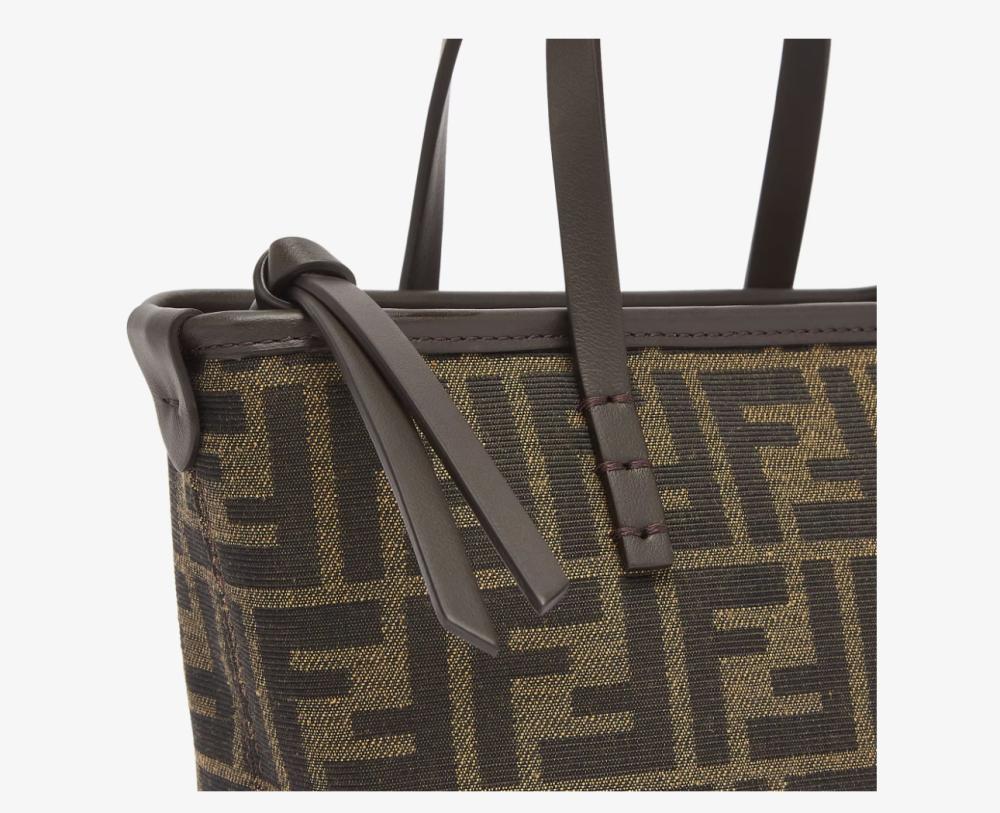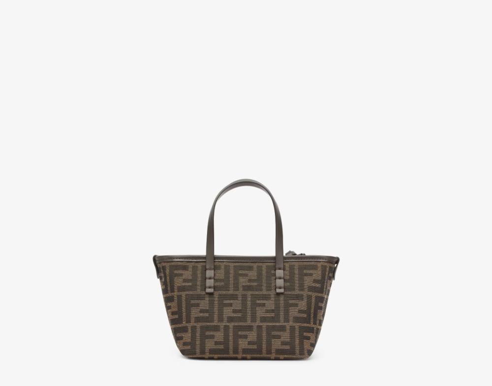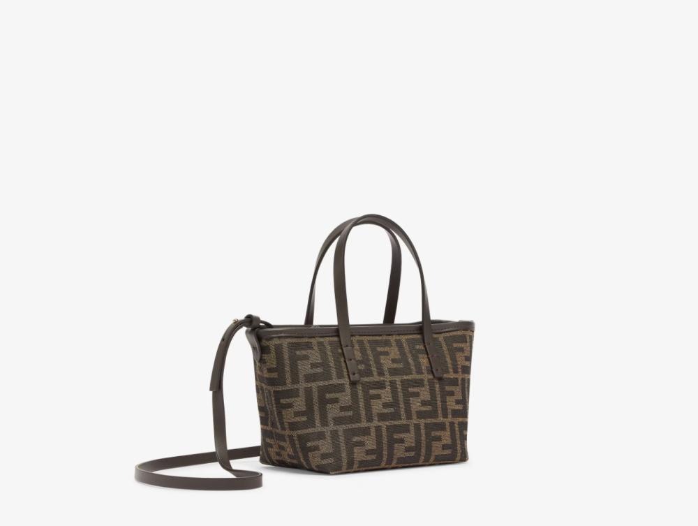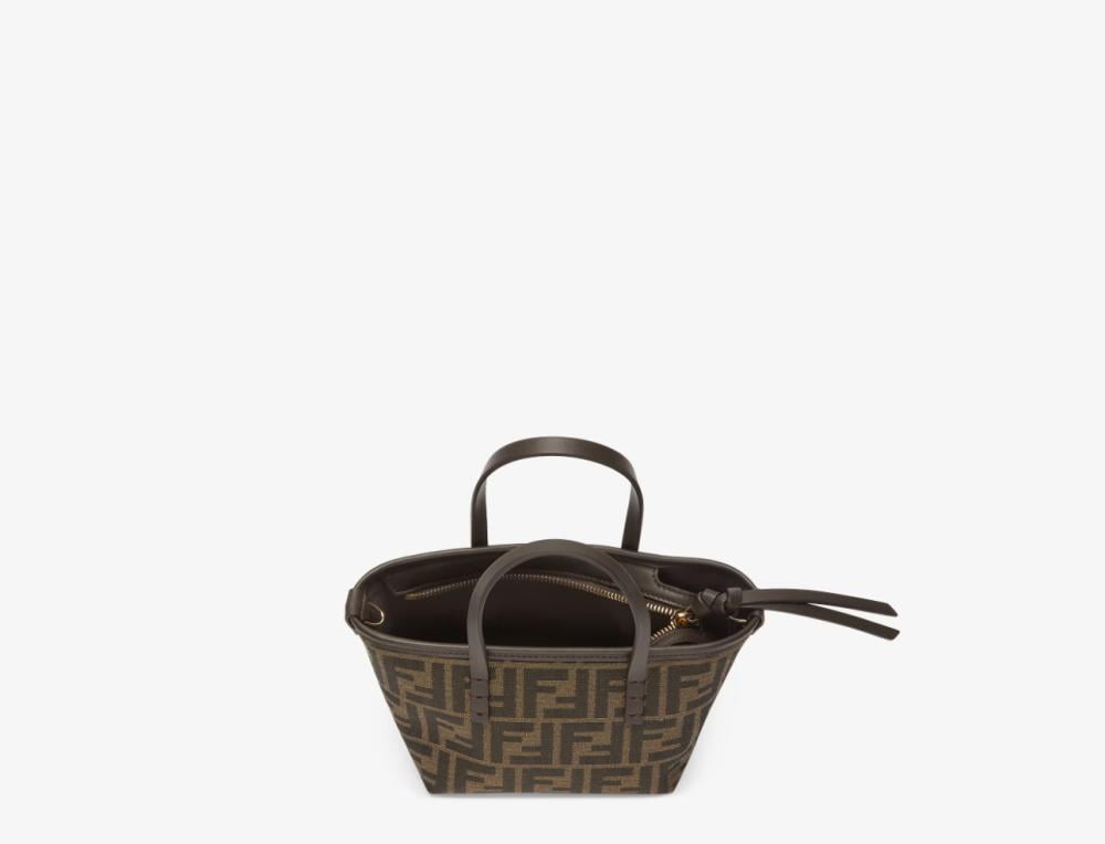 حقيبة تسوق صغيرة مصنوعة من قماش الجاكار مع نقشة FF بنية اللون. مزينة بجلد بني غامق وسحاب للإغلاق مع سحّاب جلدي طويل معقود.