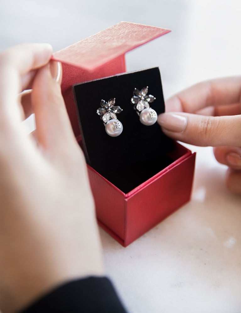 أقراط متدلية مطلية بالفضة تتميز بزهرة الياسمين المزينة بالكريستال، وزهرة CH Carolina Herrera الشهيرة، ومرصعة بلؤلؤ صناعي ومفصلة بالأحرف الأولى من اسم كارولينا.
