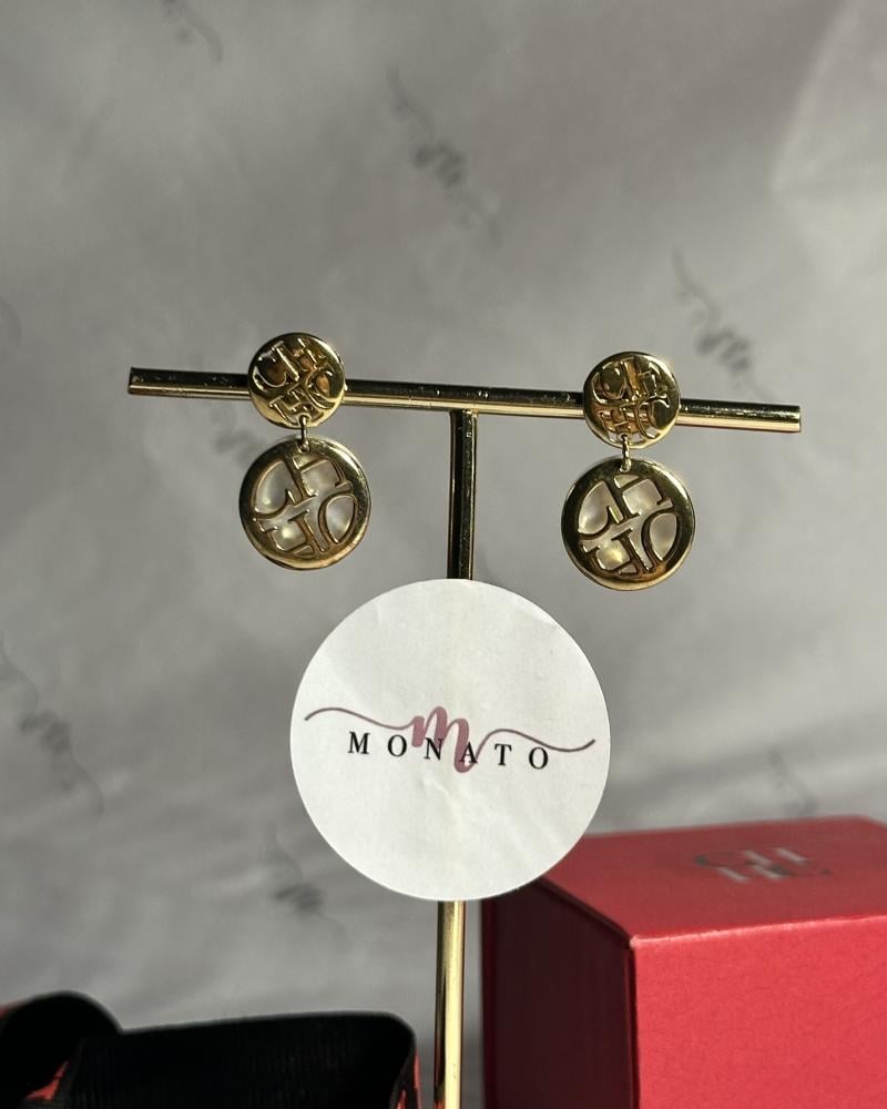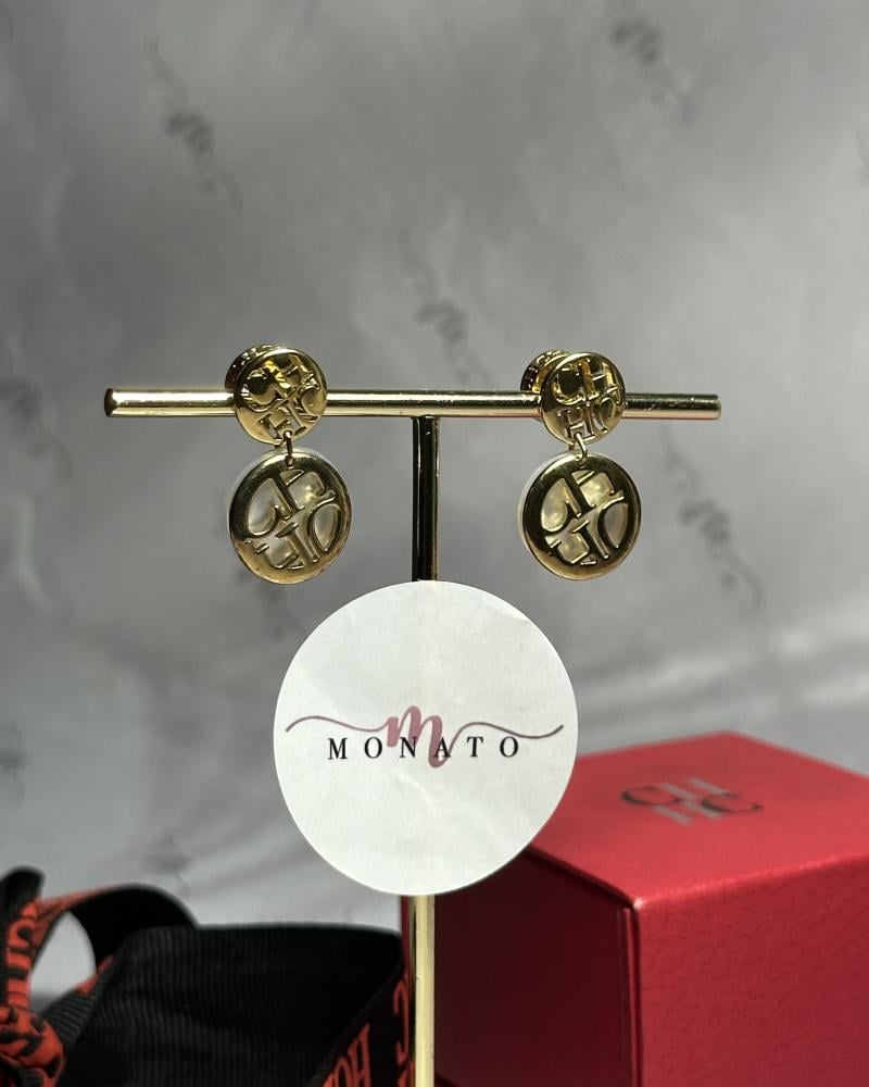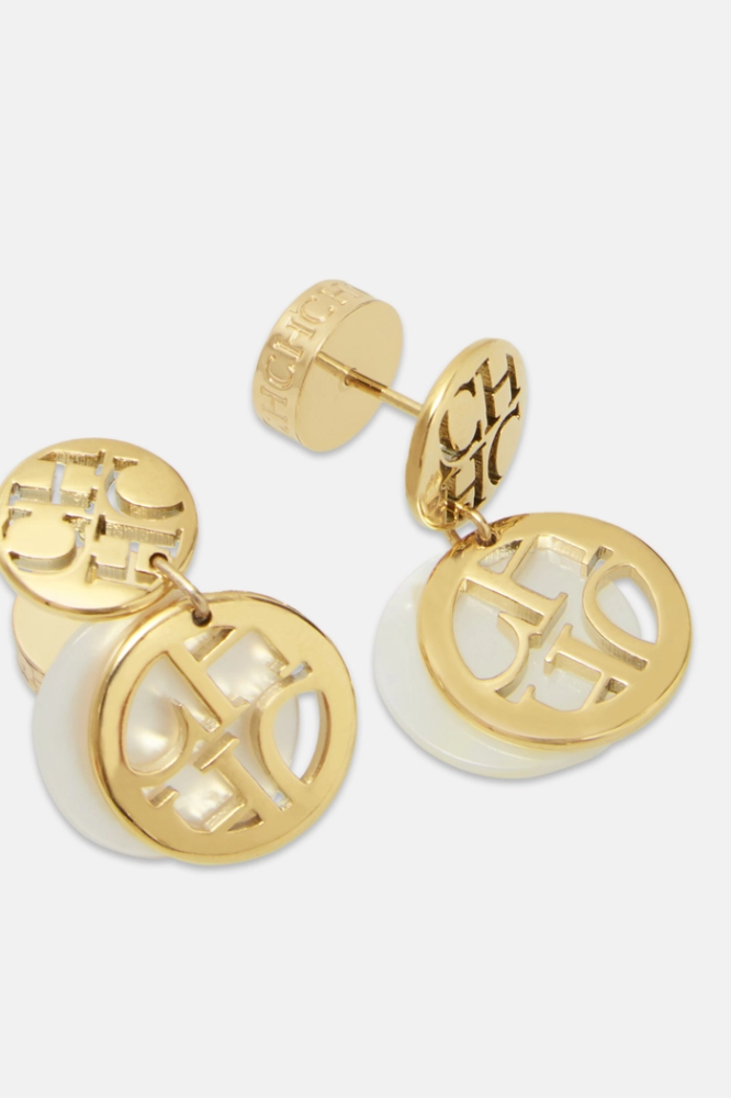 أقراط متدلية مطلية بالذهب تتميز بميداليتين مع الأحرف الأولى من اسم كارولينا مقطوعة بالقالب فوق أقراص من عرق اللؤلؤ.