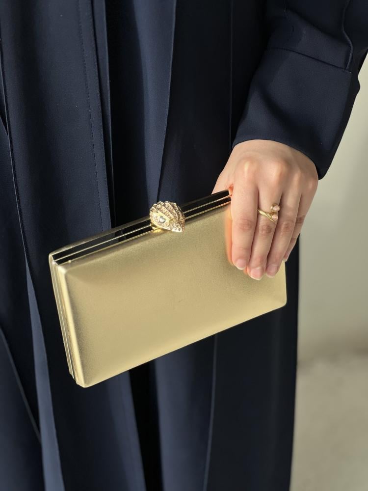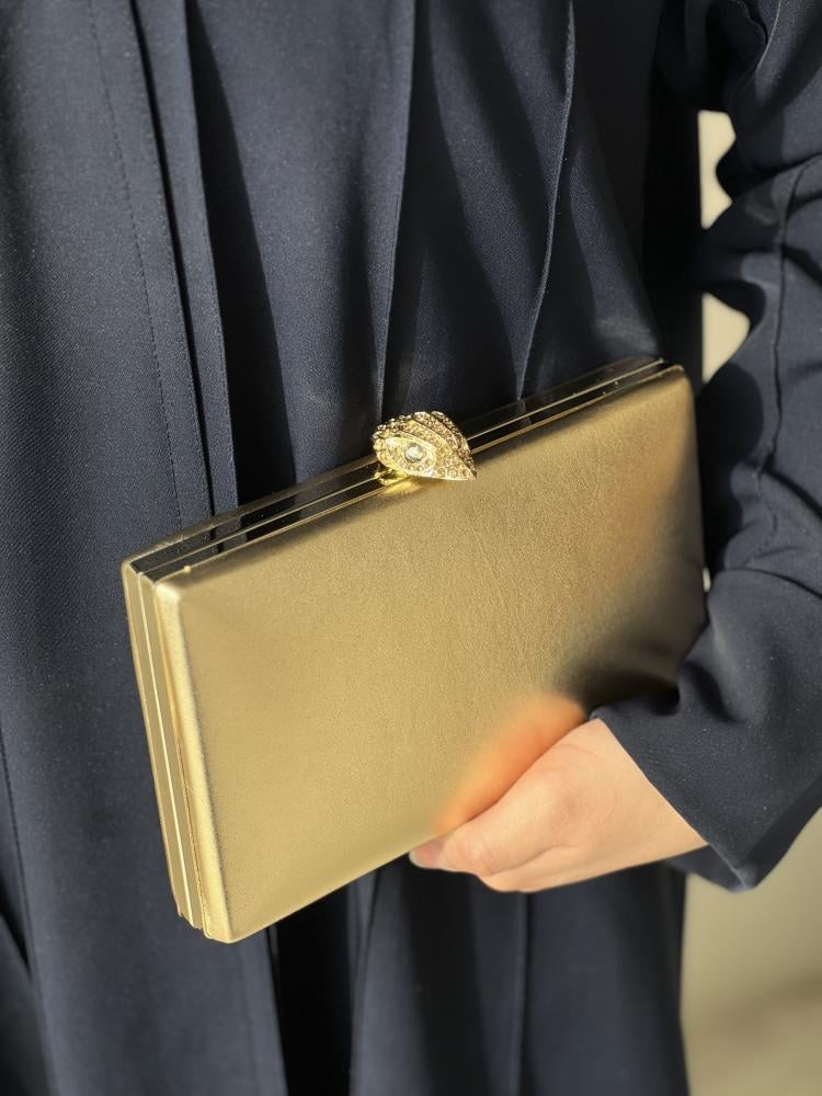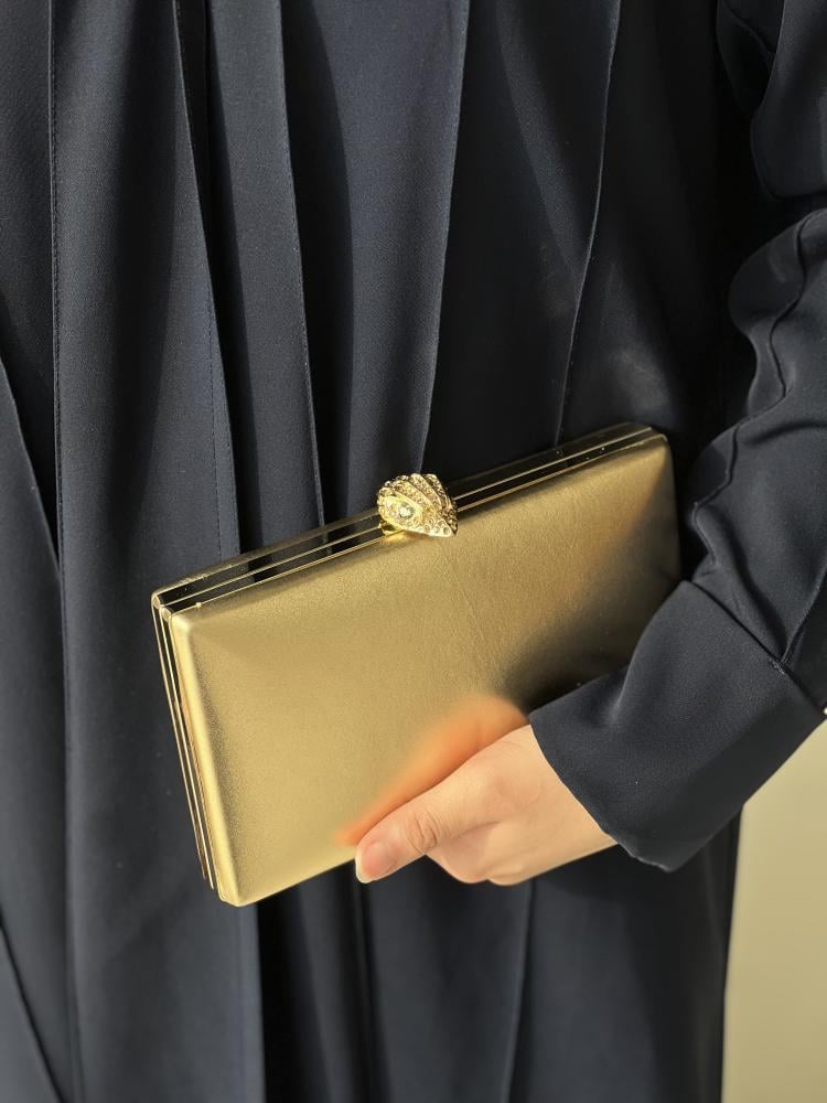 حقيبة Crystal Kensington Clutch مصنوعة من الجلد باللون الذهبي. يتميز رأس النسر الذهبي بكريستالات وعيون خرزية شفافة على المشبك.