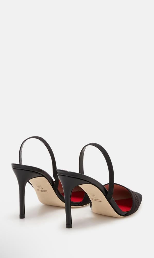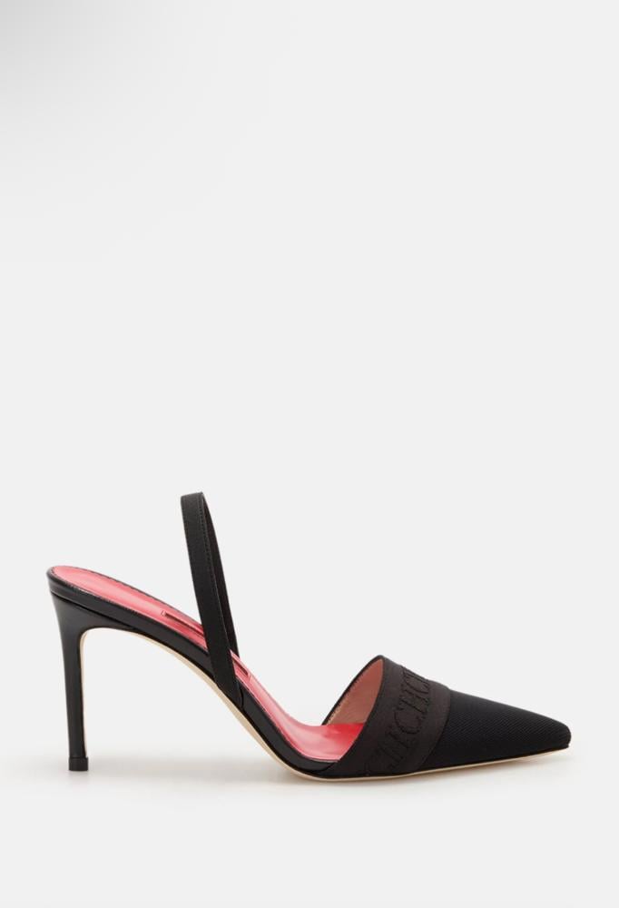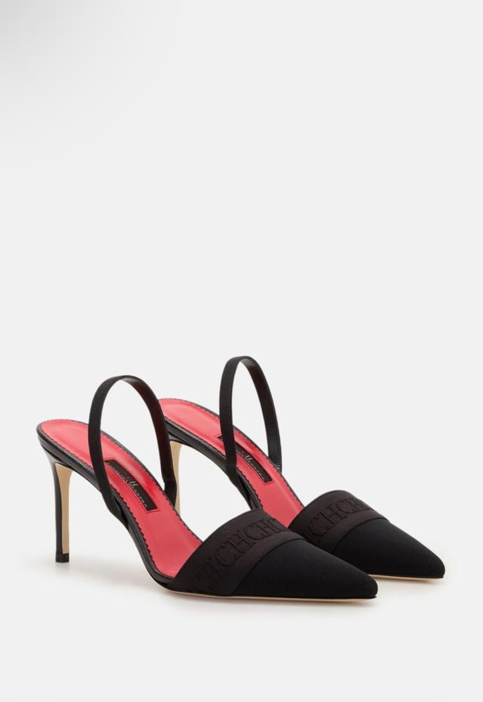 حذاء بكعب مفتوح من الخلف، مبطن بقماش، مع شريط بلون موحد، يحمل الأحرف الأولى من اسم كارولينا في المقدمة.