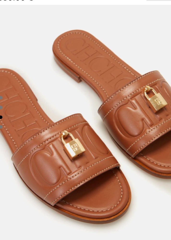 أحذية جلدية منقوشة بالأحرف الأولى من ختم كارولينا، ومُزينة بقفل مُخصص وخياطة متباينة.