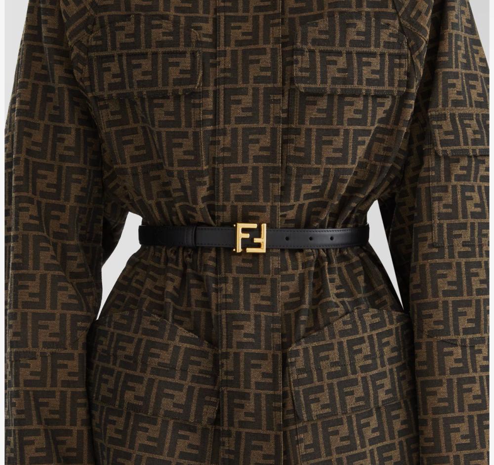 حزام رفيع بحلقة وإبزيم FF الشهير. مصنوع من جلد أسود. معدن مطلي بالذهب.
