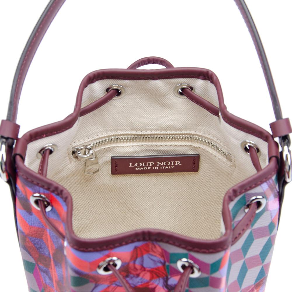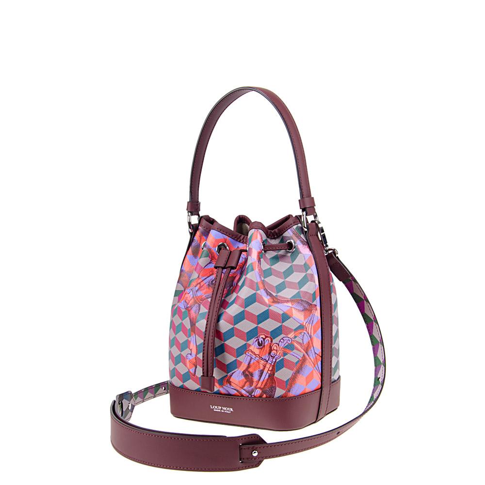 حقيبة دلو مطبوعة مميزة مصنوعة بحزام كتف قابل للفصل والتعديل بالإضافة إلى مقبض علوي لتعدد الاستخدامات. الموديل المبطن بالقطن واسع بما يكفي لحمل محفظتك ومذكراتك وهاتفك المحمول. تأتي مع جيب داخلي بسحاب. صنع في إيطاليا. 16x12x22 سم. 100% جلد عجل + 70% بولي يوريثين 17% بولي يوريثين 13% CO.
