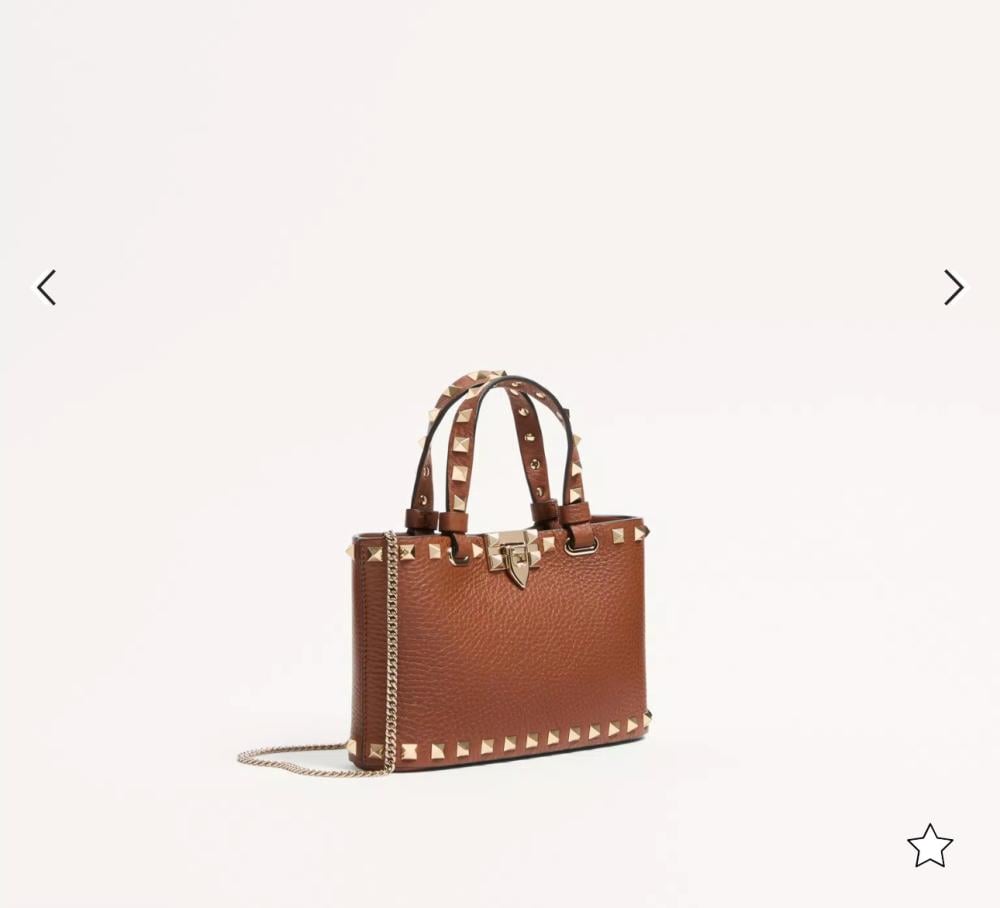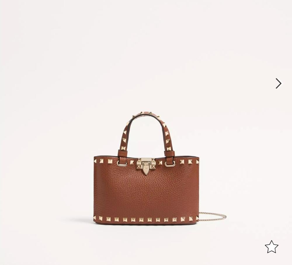 حقيبة تسوق صغيرة من فالنتينو غارافاني روكستد، مصنوعة من جلد العجل الحبيبي. يمكن حملها باليد أو على الكتف/كروس بودي بفضل المقابض والسلسلة القابلة للفصل.