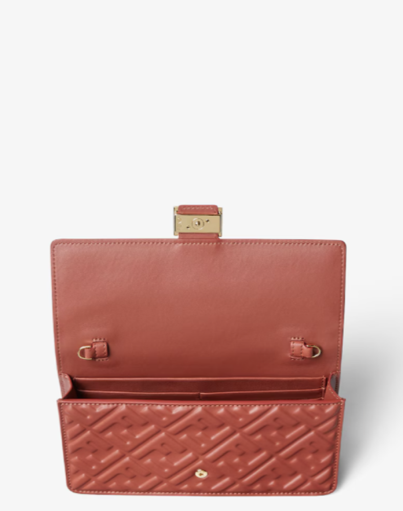محفظة باغيت مدمجة بغطاء ومشبك بشعار FF. جيب داخلي بستة فتحات للبطاقات. حزام كتف مزدوج، أحدهما جلدي قابل للتعديل والآخر بسلسلة رفيعة قابلة للفصل: لحمل الحقيبة كحقيبة يد صغيرة، أو تحت الذراع، أو بشكل كروس بودي. مصنوعة من جلد نابا ناعم بلون بني سيينا، مزينة بنقش ثلاثي الأبعاد لشعار FF الشهير. معدن مطلي بالذهب.