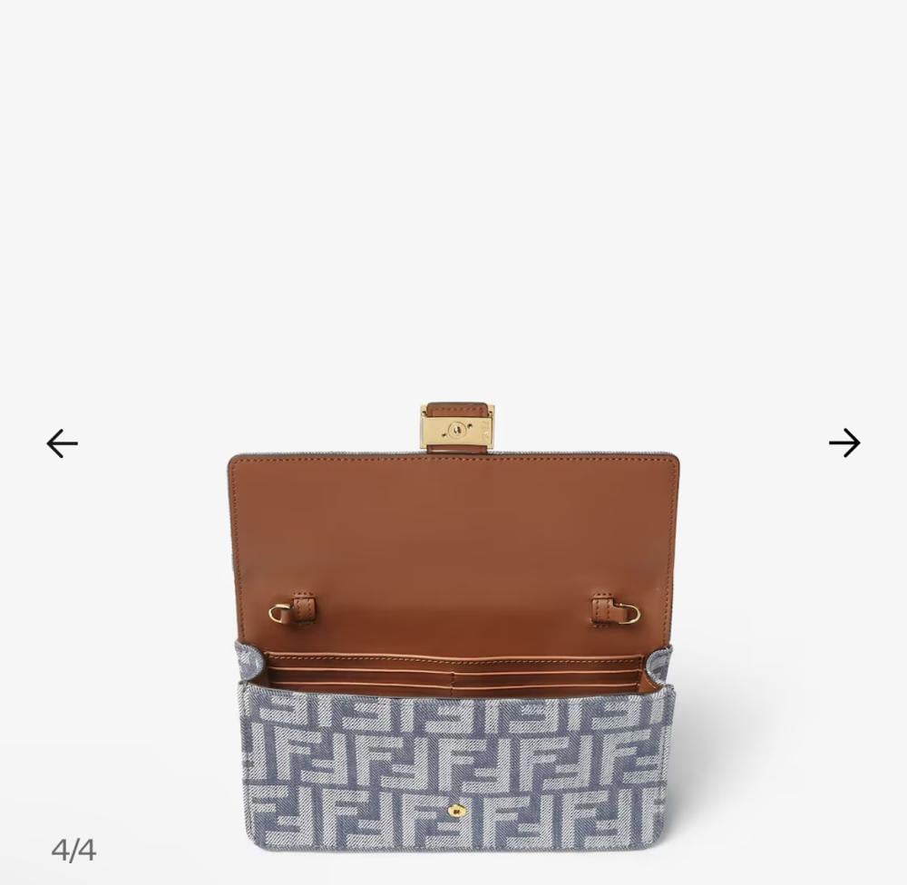 محفظة باغيت مدمجة بغطاء ومشبك بشعار FF. جيب داخلي بستة فتحات للبطاقات. حزام كتف مزدوج، أحدهما جلدي قابل للتعديل والآخر قابل للفصل بسلسلة رفيعة: لحمل الحقيبة كحقيبة يد صغيرة، أو تحت الذراع، أو بشكل كروس بودي. مصنوعة من قماش جاكار بنقشة الدنيم بشعار FF بدرجات اللون الأزرق. معدن مطلي بالذهب.